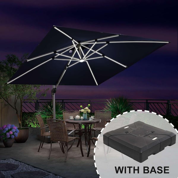 10 ft. Square Aluminum Solar Powered LED Patio Cantilever Offset Umbrella with Stand, Navy Blue