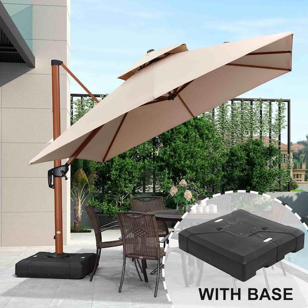 10 ft. Square High-Quality Wood Pattern Aluminum Cantilever Patio Umbrella with Stand, Beige