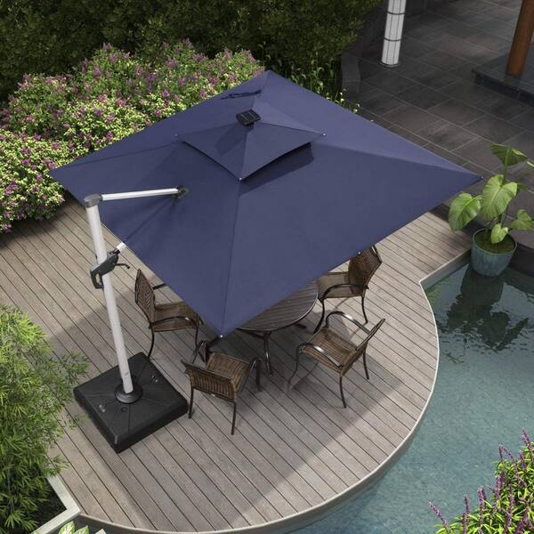 10 ft. Square Solar powered LED Patio Umbrella Outdoor Cantilever Umbrella Heavy Duty Sun Umbrella in Navy Blue