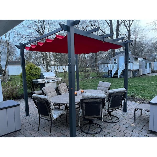 10 ft. W x 10 ft. D Modern Gray Aluminum Pergola with Red Adjustable UV Resistant Sun Shelter Canopy for Outdoor Porch