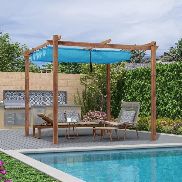 10 ft. x 10 ft. Natural Wood Grain Aluminum Pergola Gazebo with Blue Retractable Sunshade Canopy and Extra Top Roof