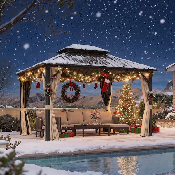 10 ft. x 12 ft. Bronze Aluminum Outdoor Hardtop Gazebo Metal Frame Galvanized Double Roof with Curtains and Nettings