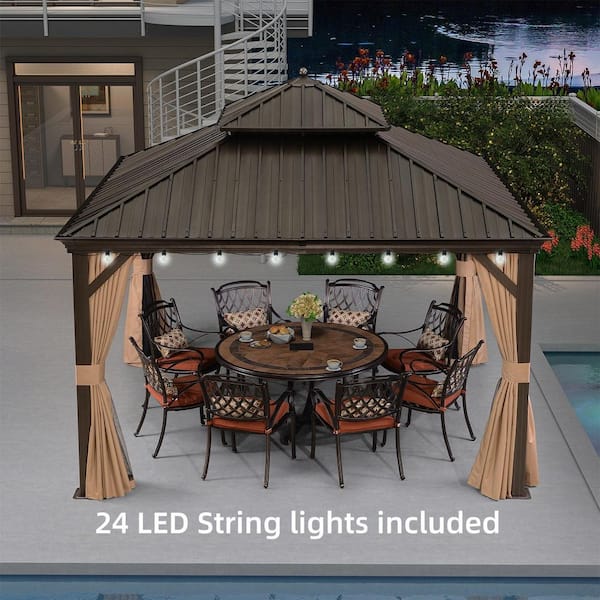 10 ft.x 12 ft.Bronze Patio Outdoor Gazebo for Backyard Hardtop Aluminum Frame with Hooks,Netting,Khaki Curtain,24 Lights