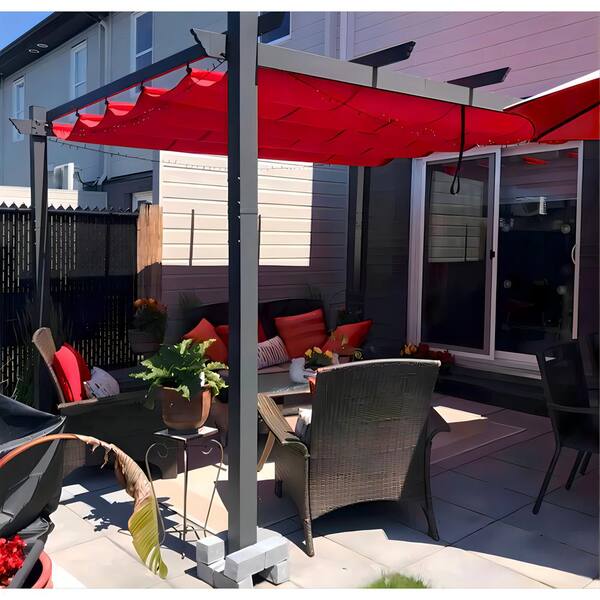 10 ft. x 12 ft. Gray Aluminum Frame Outdoor Patio Pergola Gazebo with Red Retractable Sun Shade Canopy for Garden