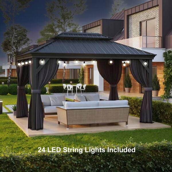 10 ft. x 12 ft. Gray Patio Outdoor Gazebo for Backyard Hardtop Aluminum Frame, Hooks, Netting, Curtain 24-Lights