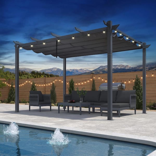 10 ft. x 13 ft. Dark Gray Aluminum Frame Pergola with Gray Retractable Sun Shade Canopy Extra Roof and String Lights