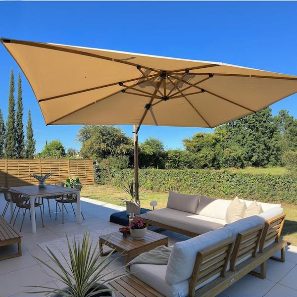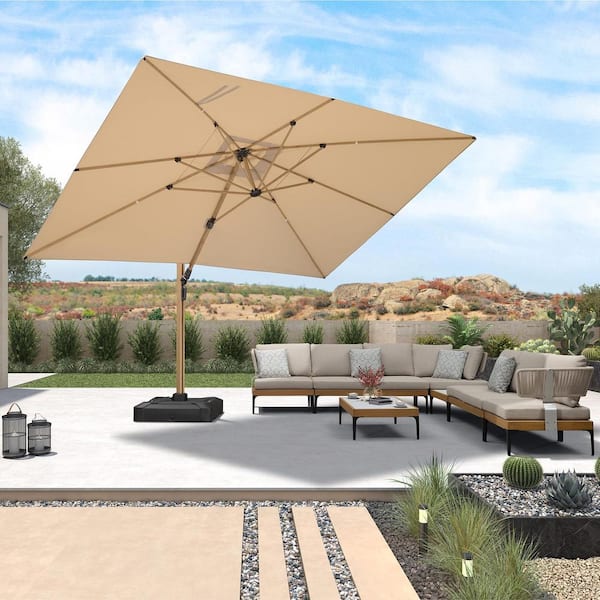 10 ft. x 13 ft. Outdoor Cantilever Patio Umbrella Teak Finished Offset 360° Rotation Umbrella with Base, Beige