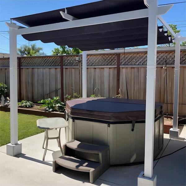 10 ft. x 13 ft. White Aluminum Frame Patio Pergola Gazebo with Navy Blue Retractable Sunshade Canopy and Extra Top Roof
