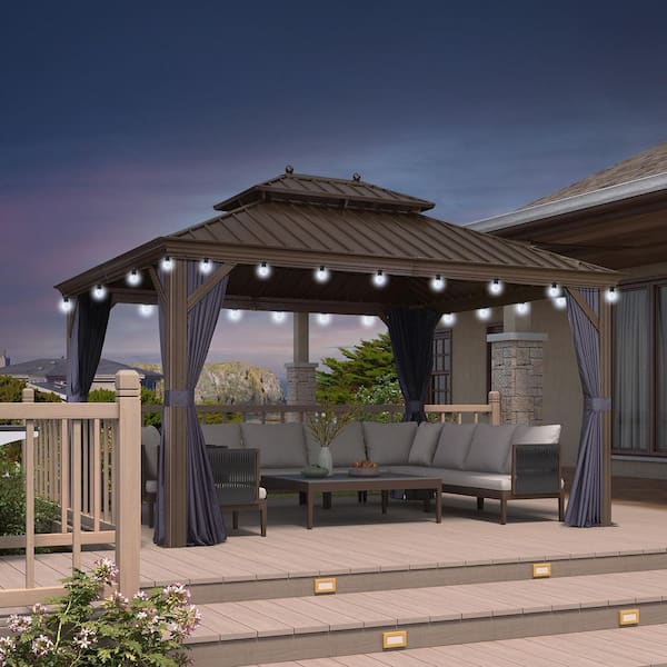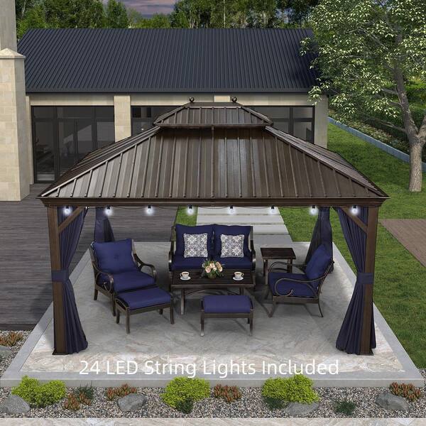 10 ft.x 14 ft.Bronze Patio Outdoor Gazebo for Backyard Hardtop Aluminum Frame with Hooks,Netting ,Blue Curtain,24 Lights