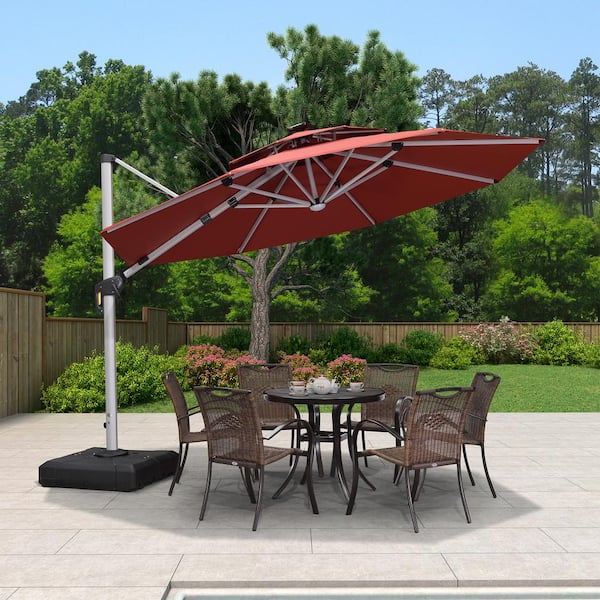 11 ft. Octagon Aluminum Solar Powered LED Patio Cantilever Offset Umbrella with Base, Brick Red
