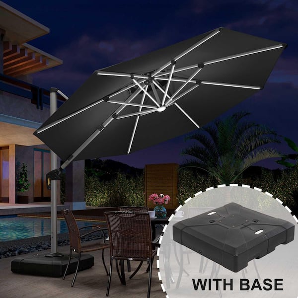 11 ft. Octagon Aluminum Solar Powered LED Patio Cantilever Offset Umbrella with Stand, Black
