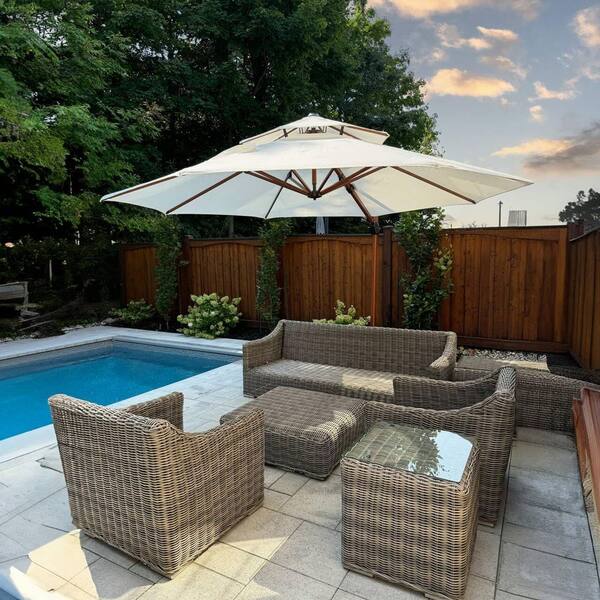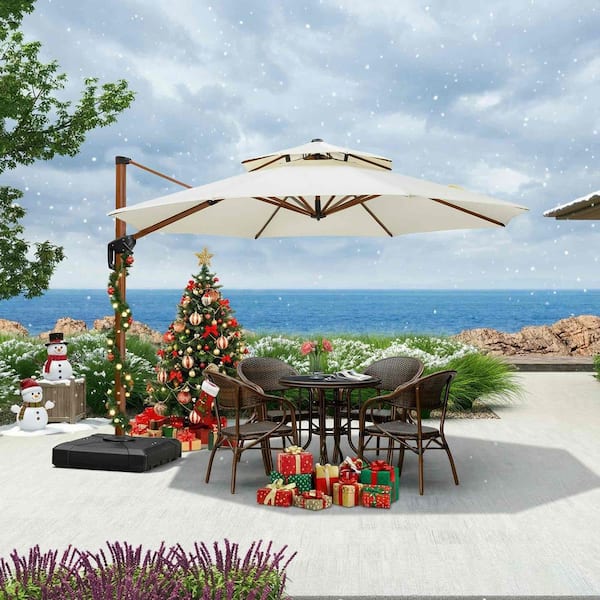 11 ft. Octagon High-Quality Wood Pattern Aluminum Cantilever Patio Umbrella with Stand, Cream