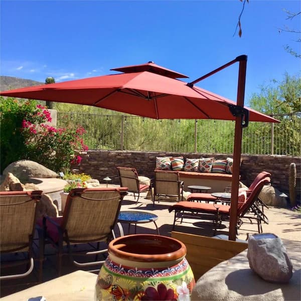 11 ft. Square All-aluminum 360° Rotation Wood pattern Cantilever Offset Outdoor Patio Umbrella in Brick Red