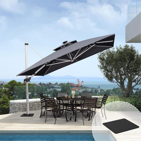 11 ft. Square Aluminum Solar Powered LED Patio Cantilever Offset Umbrella with Base Plate, Gray
