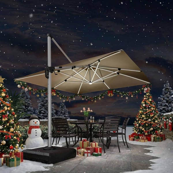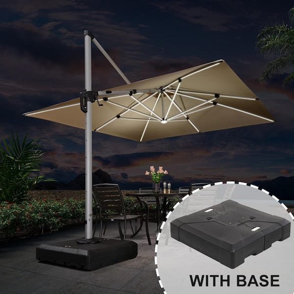 11 ft. Square Aluminum Solar Powered LED Patio Cantilever Offset Umbrella with Stand, Beige
