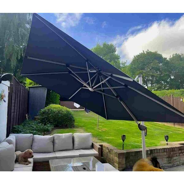 11 ft. Square Aluminum Solar Powered LED Patio Cantilever Offset Umbrella with Stand, Gray