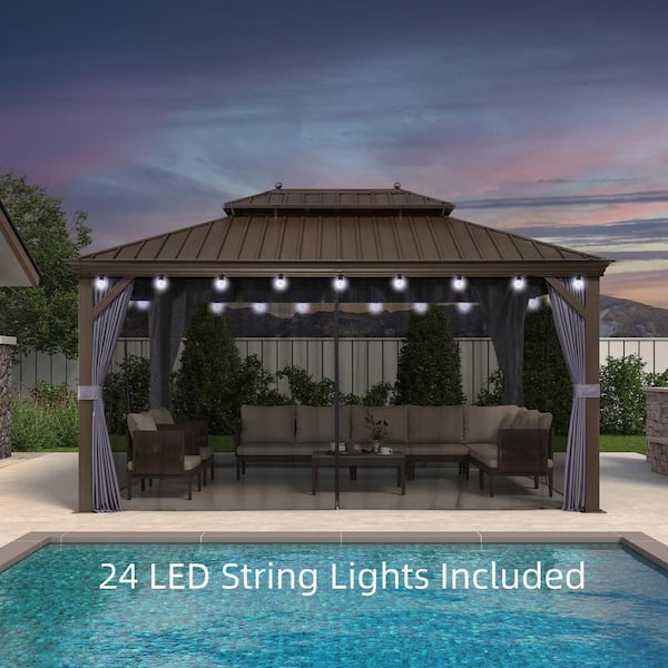 11 ft. x 15 ft. Bronze Patio Outdoor Gazebo for Backyard Hardtop Aluminum Frame with Hook Netting Blue Curtain 24 Lights