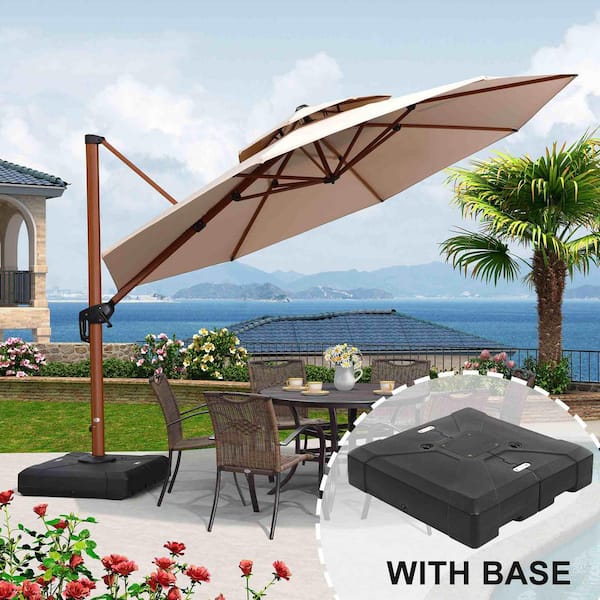 12 ft. Octagon High-Quality Wood Pattern Aluminum Cantilever Patio Umbrella in Beige with Stand
