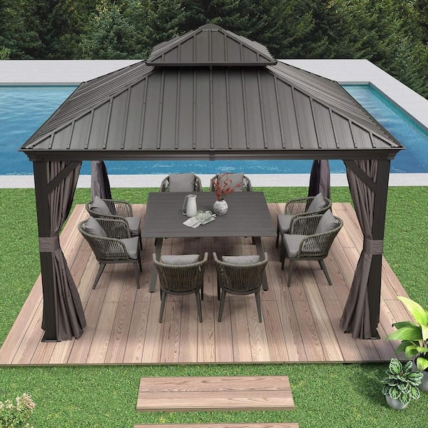 12 ft. x 12 ft. Gray Aluminum Hardtop Gazebo Canopy for Patio Deck Backyard Heavy-Duty with Netting and Curtains