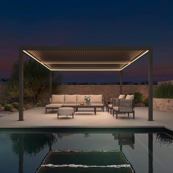 12 ft. x 14 ft. Bronze Aluminum Frame Patio Louvered Pergola Gazebo with Adjustable Sunshade Roof and LED Strip Lights