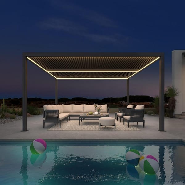 12 ft. x 14 ft. Gray Aluminum Frame Outdoor Louvered Pergola Gazebo with Adjustable Sunshade Roof and LED Strip Lights