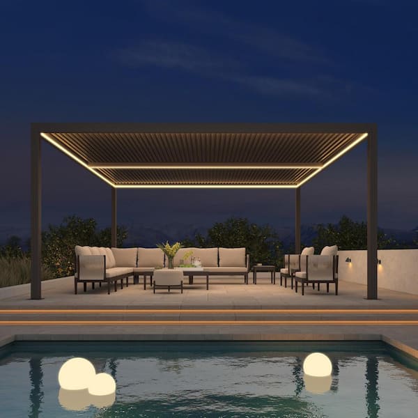 12 ft. x 16 ft. Bronze Aluminum Frame Patio Louvered Pergola Gazebo with Adjustable Sunshade Roof and LED Strip Lights