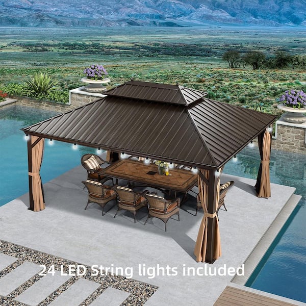 12 ft.x 16 ft.Bronze Patio Outdoor Gazebo for Backyard Hardtop Aluminum Frame with Hooks,Netting,Khaki Curtain,24 Lights