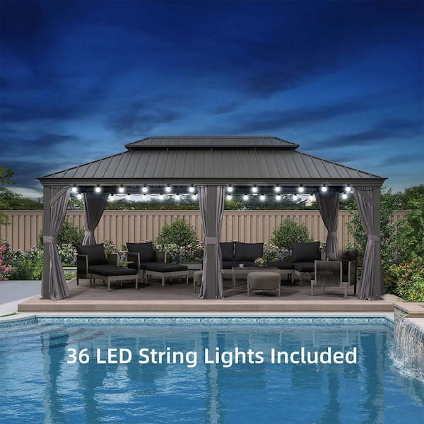 12 ft. x 18 ft. Gray Patio Outdoor Gazebo for Backyard Hardtop Aluminum Frame with Hooks, Netting, Curtain 36-Lights