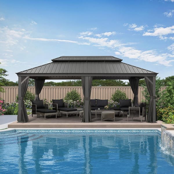 12 ft. x 18 ft. Luxury Patio Outdoor Gazebo for Backyard Hardtop Aluminum Frame with Netting, Hooks, Upgrade Curtain