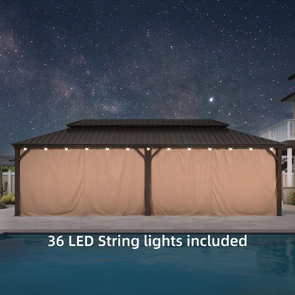 12 ft.x 26 ft.Bronze Patio Outdoor Gazebo for Backyard Hardtop Aluminum Frame with Hooks,Netting,Khaki Curtain,48-Lights