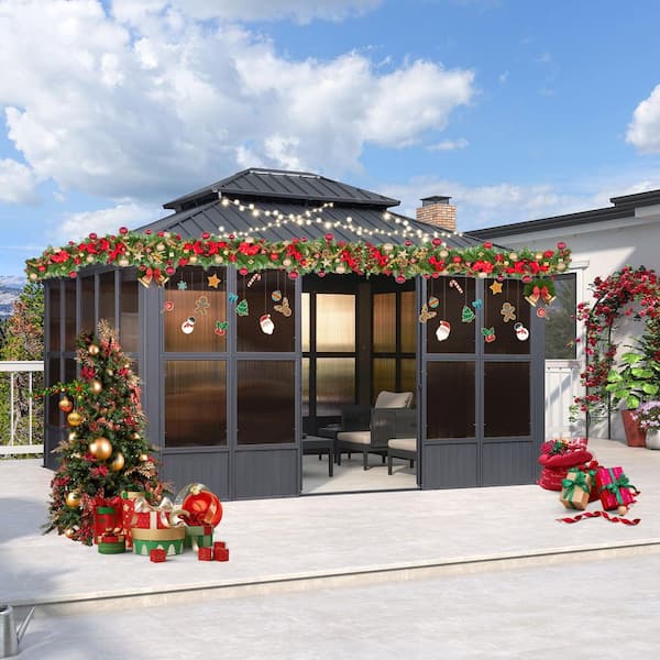 12ft.x14ft. Sunroom Hardtop Gazebo Solarium Galvanized Steel Double Roof Aluminum PC Mesh Screen House for Backyard Gray
