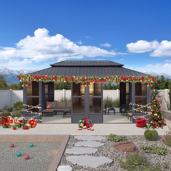 12ft.x20ft. Sunroom Hardtop Gazebo Solarium Galvanized Steel Double Roof Aluminum PC Mesh Screen House for Backyard Gray
