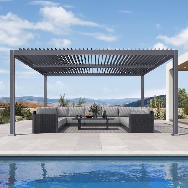13.1 ft. x 15.1 ft. Gray Aluminum Outdoor Louvered Pergola with 2-Individual Adjustable Roofs and In-Built Gutter System