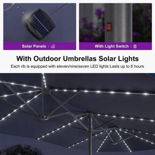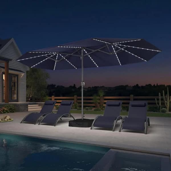 15 ft. Gray Aluminum Solar LED Lights Market Umbrella with Double-Sided Outdoor Patio Umbrellas with Base in Navy Blue