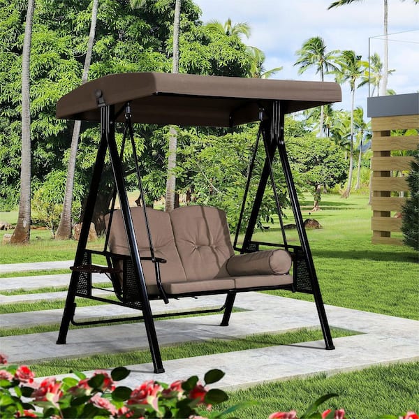 2-Person Steel Metal Patio Swing with Canopy and Cushions, Beige