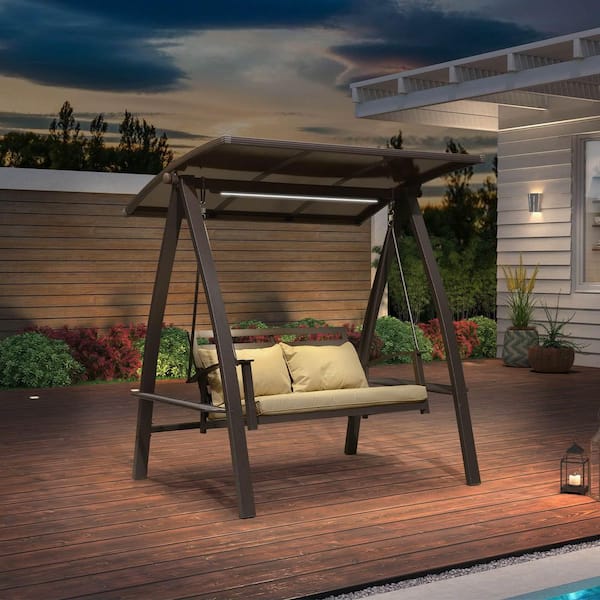 2-Seat Porch Swing with Adjustable PVC Canopy Swing Bed with Metal and Side Cup Holder, Cushion and Pillows Included
