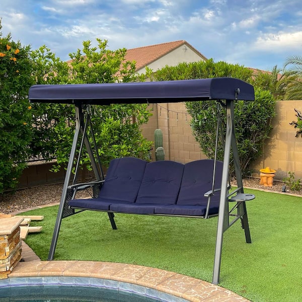 3-Person All-Weather Steel Frame Porch Swing with Adjustable Tilt Canopy, Cushions and Pillow Included, Navy Blue