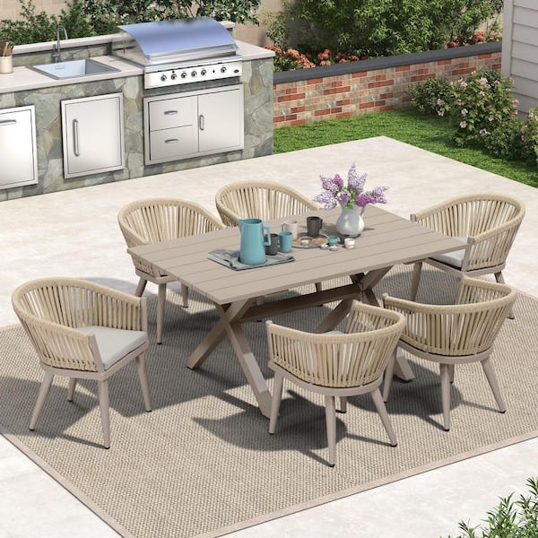 7 Piece Aluminum All-Weather PE Rattan Rectangular Outdoor Dining Set with Cushion, Champagne