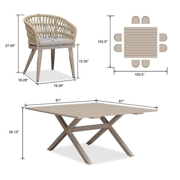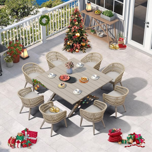 9-Piece Aluminum All-Weather PE Rattan Square Outdoor Dining Set with Cushion, Champagne