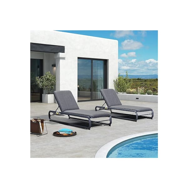 Chaise Lounge Gray 2 pieces Metal Outdoor Recliner w/Slide-Out Side Table with Cushion Adjustable Backrest