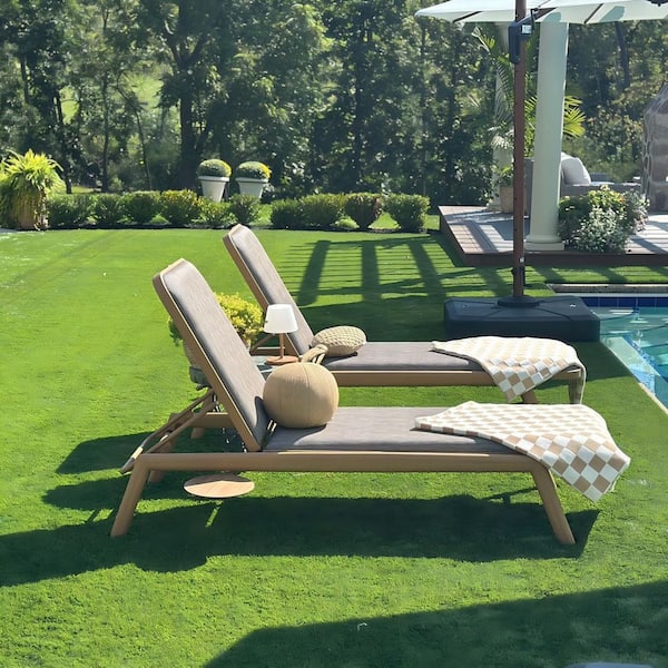 Chaise Lounge Teak 2 pieces Metal Outdoor Recliner w/Slide-Out Side Table with Beige/Tan Cushion Adjustable Backrest