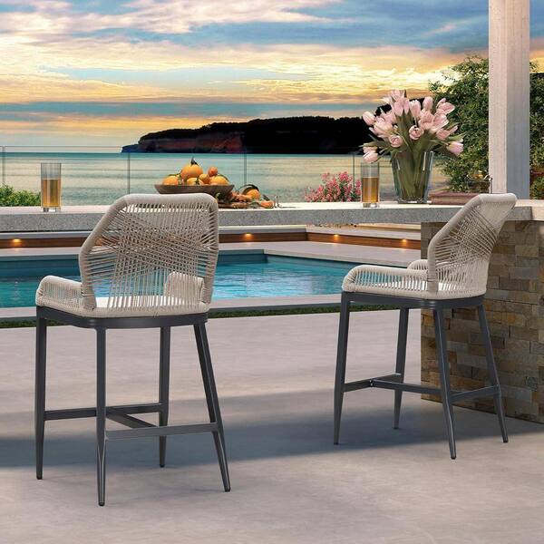 Modern Aluminum Boho Woven Outdoor Counter Height Outdoor Bar Stools with Back and Scallop Cushion, Dark Gray(2 pack)