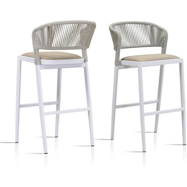Modern Aluminum Low Back Rattan Bar Height Outdoor Bar Stool with Backrest and Umber Cushion, White(2-Pack)
