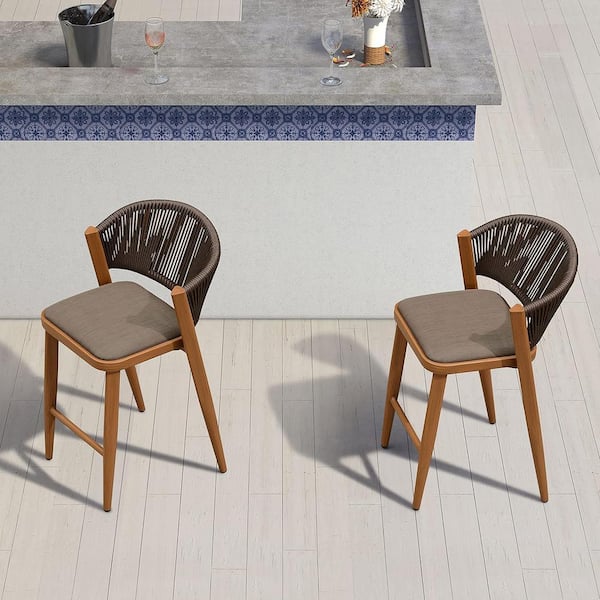 Modern Aluminum Low Back Rattan Counter Height Outdoor Bar Stool with Backrest and Brown Cushion (2-Pack)