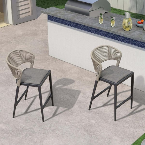 Modern Aluminum Low Back Rattan Counter Height Outdoor Bar Stool with Backrest and Dark Gray Cushion (2-Pack)