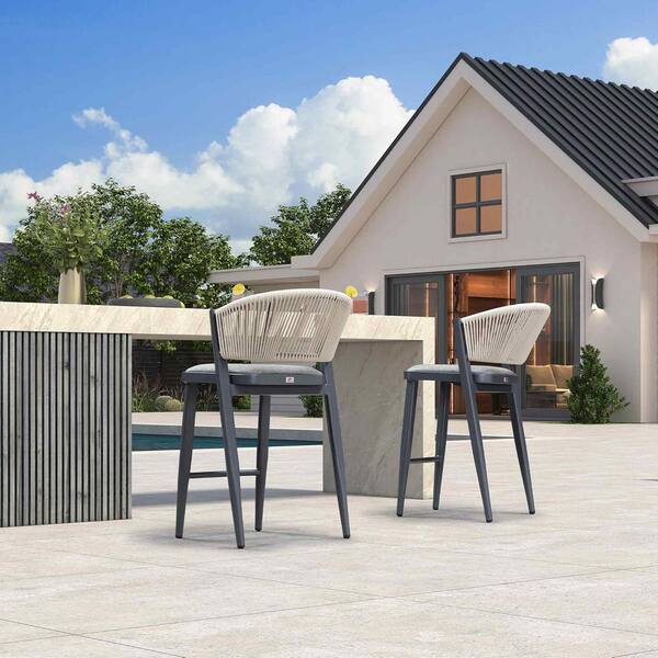 Modern Aluminum Low Back Rattan Counter Height Outdoor Bar Stool with Backrest and Dark Gray Cushion, Drak Gray(2-Pack)