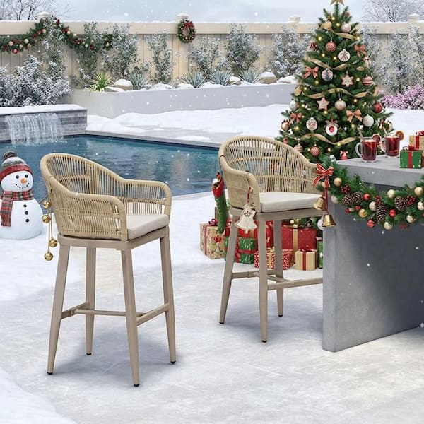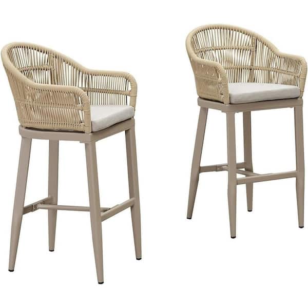 Modern Aluminum Rattan Bar Height Outdoor Bar Stool with Back and Beige Cushion (2-Pack)