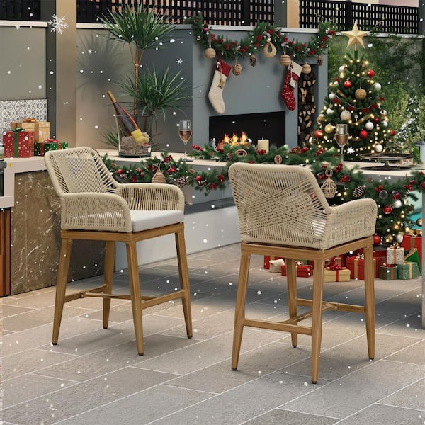 Modern Aluminum Rattan Counter Height Outdoor Bar Stool with Back and Beige Cushion (2-Pack)