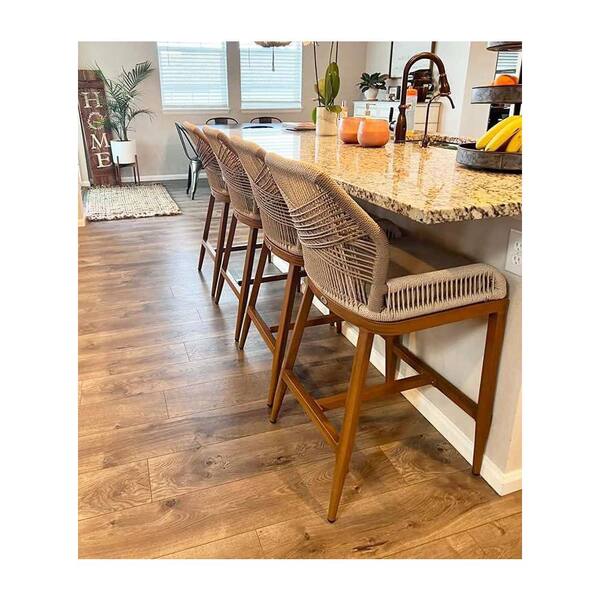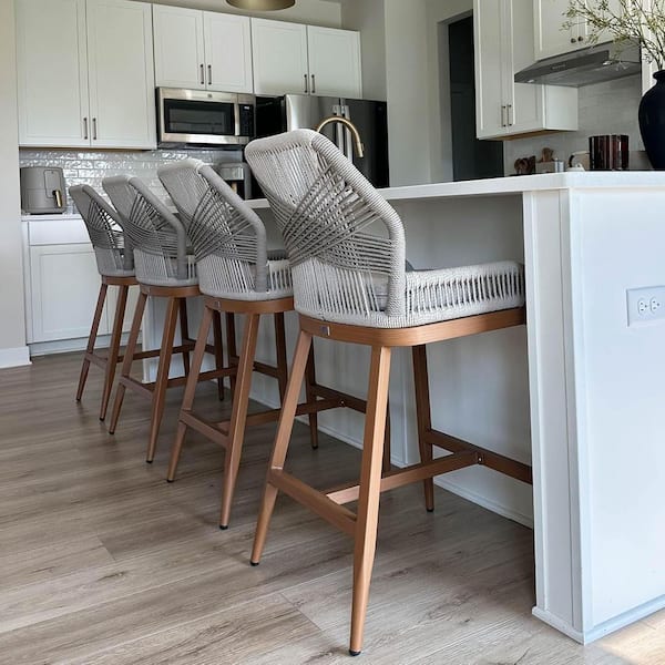 Modern Aluminum Twill Wicker Woven Bar Height Outdoor Bar Stool with Back and Beige Cushion (4-Pack)
