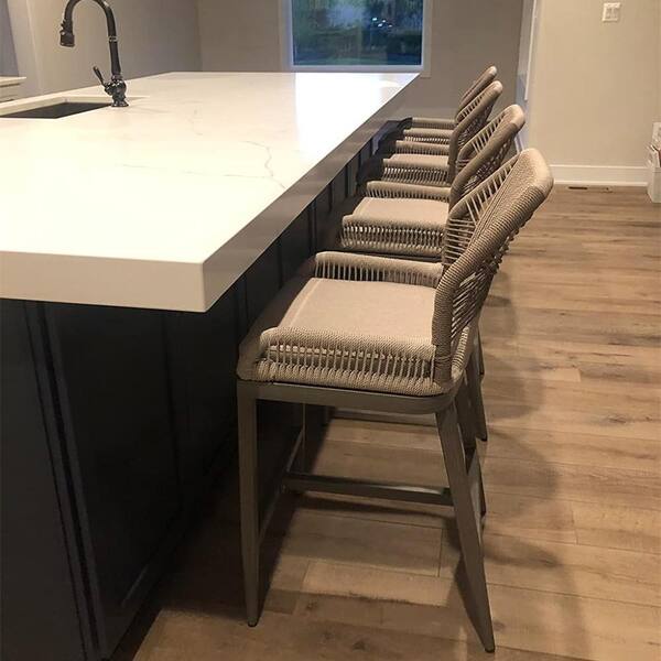 Modern Aluminum Twill Wicker Woven Bar Height Outdoor Bar Stool with Back and Beige Cushion (4-Pack)